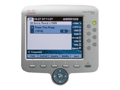 The Cisco Unified IP Phone 7975G demonstrates the latest advances in VoIP telephony, including wideband audio support, backlit color touchscreen display, and an integrated Gigabit Ethernet port. It addresses the needs of the executive or major decision maker, administrative assistants, and those working with bandwidth-intensive applications on co-located PCs. This IP phone includes a large, backlit, easy-to-read color display for easy access to communication information, timesaving applications, and features such as date and time, calling party name, calling party number, digits dialed, and presence information. It also accommodates Extensible Markup Language (XML) applications that take advantage of the display. The phone provides direct access to eight telephone lines (or combination of lines, speed dials, and direct access to telephony features), five interactive soft keys that guide you through call features and functions, and an intuitive four-way (plus Select key) navigation cluster. A hands-free speakerphone and handset designed for high-fidelity wideband audio are standard, as is a built-in headset connection.