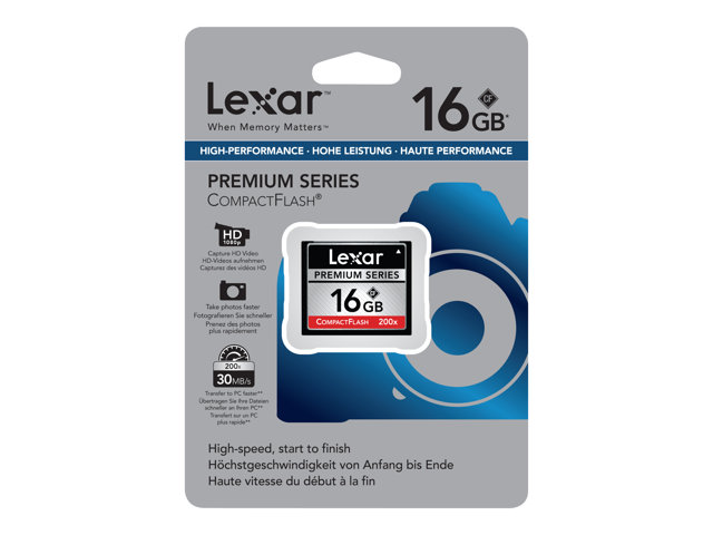 Lexar's Premium CompactFlash memory cards increase the capacity and functionality of your digital device, allowing you to take full advantage of the storage-intensive hardware, including: digital SLR cameras, digital compact cameras, digital camcorders, music players, PDAs, games consoles and more.