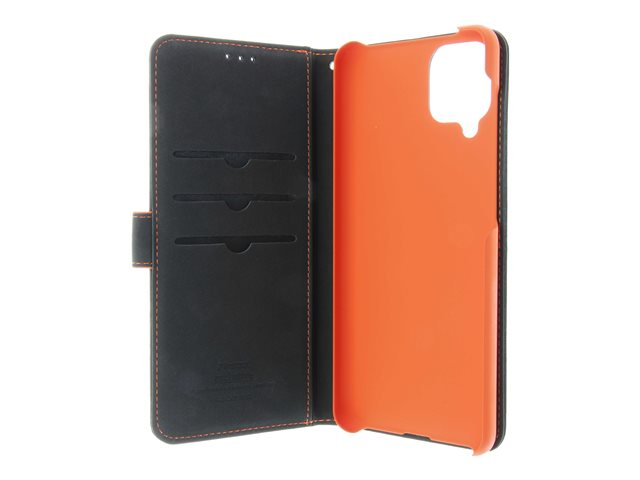 Insmat - Vikbart fodral för mobiltelefon - genuint läder, termoplastisk polyuretan (TPU), polyuretanklädsel - svart, orange, galvaniserad bronsring - för Samsung Galaxy A12 650-2971