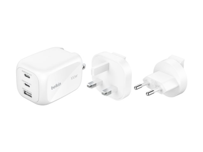 Belkin BoostCharge Pro - Strömadapter - GaN - 100 Watt - PD 3.1/PPS - 3 utdatakontakter (2 x USB-C, USB) - vit - med reseadapterkit