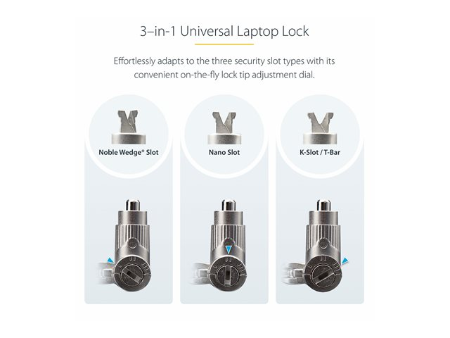 3-i-1 Laptop Lock från StarTech.com erbjuder en mångsidig säkerhetslösning som är kompatibel med Noble Wedge-, Nano- och K-Slot-enheter. Detta säkerhetskabellås är utformat för bärbara datorer och surfplattor och ger stöldskydd. Med en låsmetod som fungerar med en nyckel för ökad säkerhet, säkerställer det att enheterna förblir säkra även i utmanande miljöer.