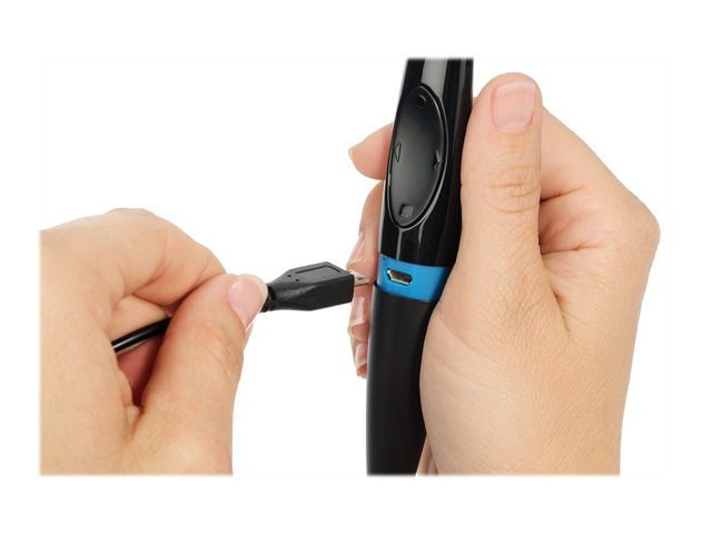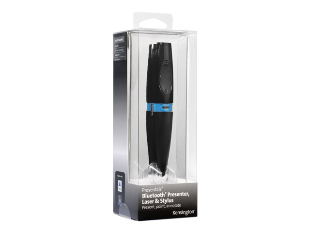 Present, point and annotate with the Kensington Presentair, designed into a sleek, comfortable pen form. The built-in presenter features an intuitive 4-button design that controls PowerPoint and Keynote. The powerful red laser pointer communicates via Bluetooth from up to 30 feet/10 meters away. And the responsive, touch-sensitive tip makes annotations a breeze. Store Presentair in the handy carrying case and recharge via the Micro USB port.